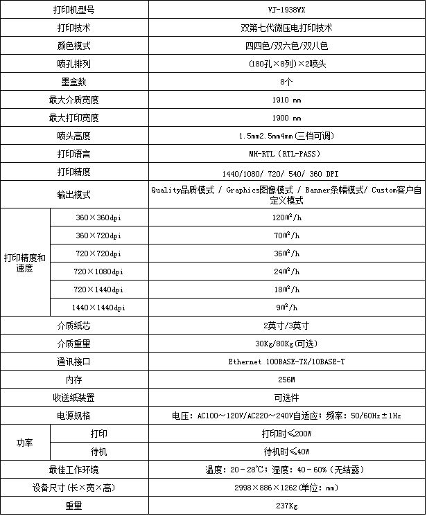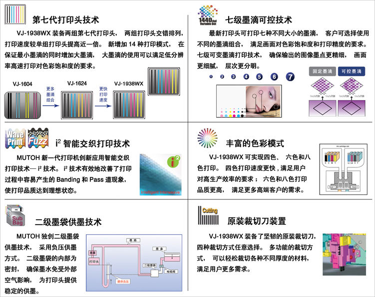 ? 最大打印幅寬1,900mm,最高打印速度四色120平米/小時,六色、八色70平米/小時;